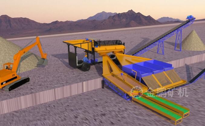 原礦通過礦用自卸車運(yùn)輸?shù)竭x金車礦倉,礦倉上設(shè)有格篩防止大塊礦石進(jìn)入到分級(jí)洗礦篩對(duì)篩子造成危害,礦石在篩子內(nèi)通過高壓水的沖洗使礦石、泥土、顆粒金分開。篩上產(chǎn)品通過皮帶運(yùn)輸機(jī)直接運(yùn)輸?shù)綇U料堆廠,篩下產(chǎn)品經(jīng)過鼓動(dòng)溜槽先進(jìn)行富集,然后再自流至固定溜槽進(jìn)一步回收有價(jià)金,通過兩次選別作業(yè)顆粒金的回收率可高達(dá)70%以上。我公司生產(chǎn)的移動(dòng)式砂金選礦車解決了原來固定式運(yùn)輸成本高的弊病更適合旱地選金。