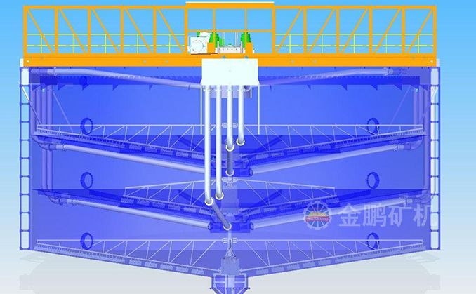 礦漿由給礦筒給入,自由沉降于耙子區(qū)的礦漿受刮板的壓力進一步濃縮,由耙子逐漸刮向池子中心,由排礦口靠重力排入下一層池子?清水經分配箱進入最下層對物料進行最后的洗滌,最下層的溢流返回分配箱進入第二層對物料進行洗滌,第二層的溢流返回分配箱進入第一層對物料進行洗滌,第一層的溢流經溢流堰排出,經三次洗滌的物料經底部排出。
