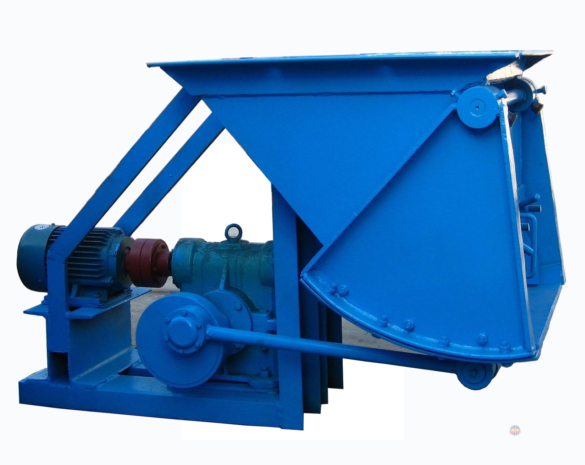 本機是利用偏心輪機構(gòu)的原理,使顎板做周期的往復運動將物料連續(xù)均勻輸送出去。其原動力是依靠電動機通過渦輪減速器帶動偏心輪,再連桿后把圓周運動變?yōu)橥鶑瓦\動,帶動顎板往復運動。當顎板向順時針方向擺動時使堆積在它上面的物料由于摩擦力而被帶動著一起運動,從存斗器內(nèi)瀉下一部分新的物料來填充機體內(nèi)所向外形成的空間,當顎板作反時針方向運動時,由于內(nèi)部物料的阻擋使物料無法再跟著顎板進入機體內(nèi)部,因此被推入按設在其下的輸料管或輸送機的接料漏斗中,總之隨著顎板的周期性擺動就能使物料連續(xù)不斷的均勻供料。
